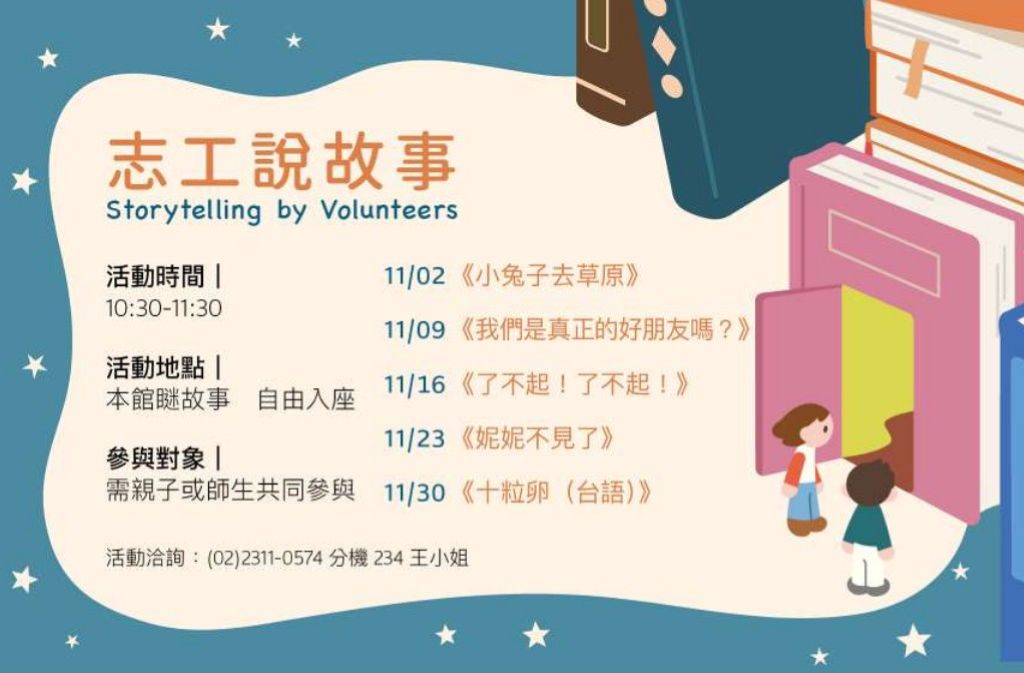 11月2日主題:小兔子去草原11月9日主題:我們是真正的好朋友嗎?11月16日主題:了不起!了不起!11月23日主題:妮妮不見了11月30日主題:十粒卵(台語)參與對象:需親子或師生共同參與洽詢電話:(02)2311-0574分機234