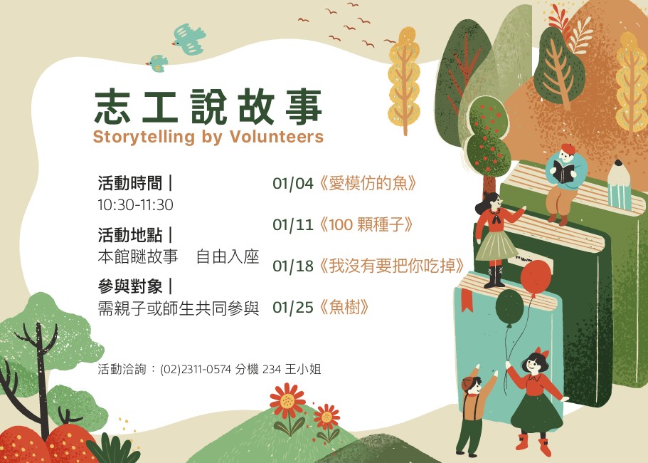 1月4日主題:愛模仿的魚1月11日主題:100顆種子1月18日主題:我沒有要把你吃掉1月25日主題:魚樹參與對象:需親子或師生共同參與洽詢電話:(02)2311-0574分機234